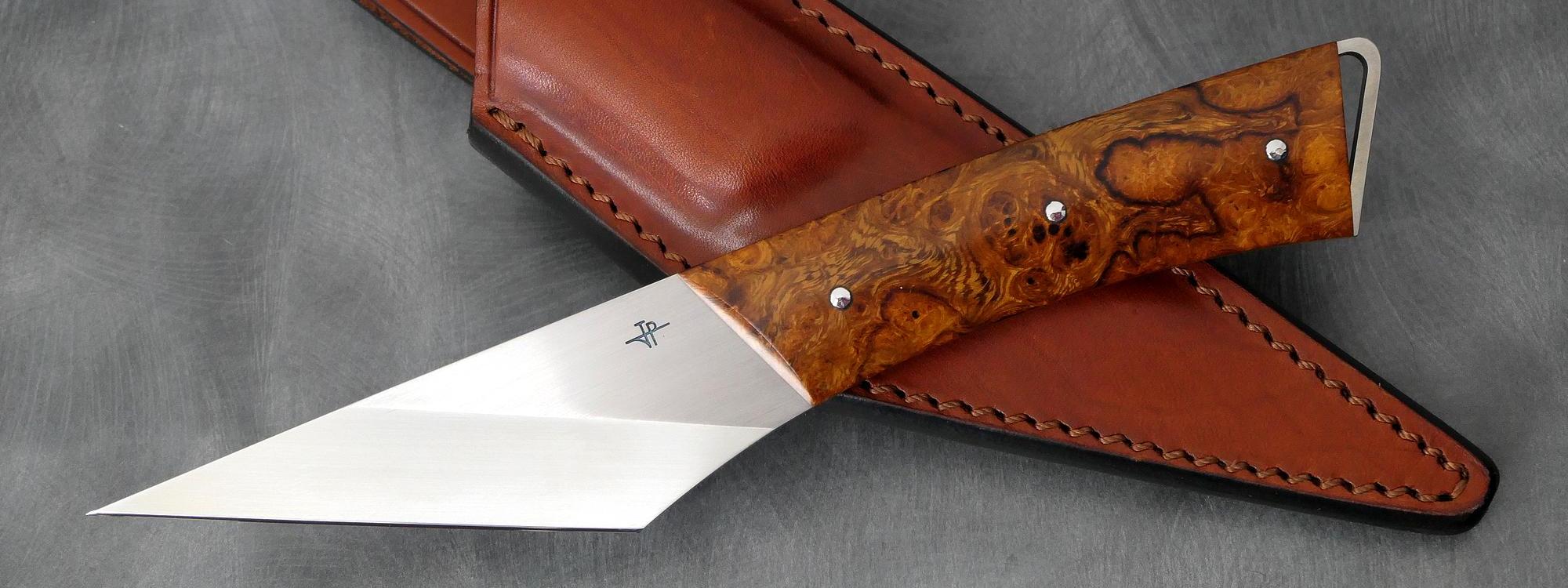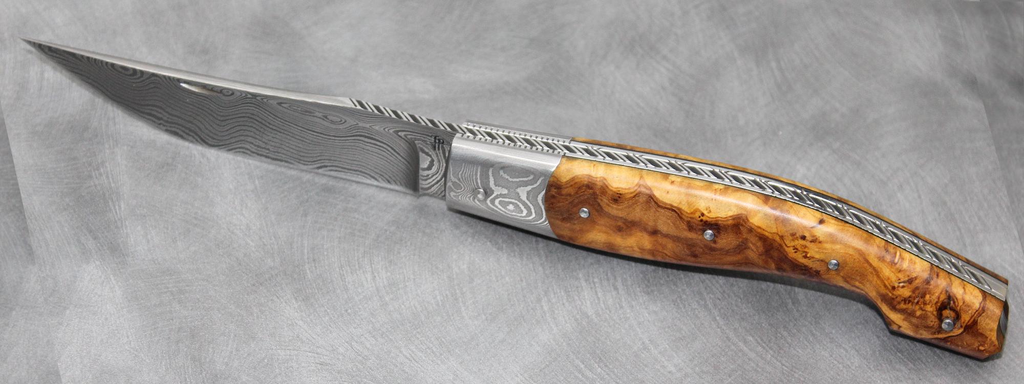 Mr Daniel F m’avait acheté dans mes premières années plusieurs couteaux que j’avais en dépôt au CE de Aérospatiale d’Airbus. Vingt cinq ans après il souhaitait Se faire fabriquer un très beau couteau personnalisé qu’il transmettrait ensuite à son petit fil. Le choix de l’artisan était évident un coutelier Meilleur Ouvrier de France. C’est là qu’il s’aperçut que le « petit » Ariégeois faisait parti de ce cercle très fermé des MOF, son choix était alors évident