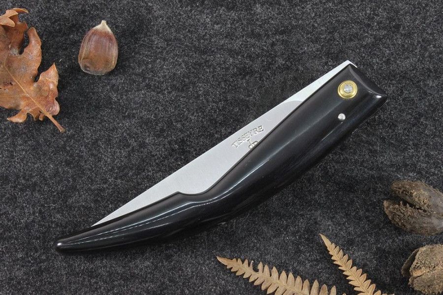 - Le manche est réalisé en pointe de corne de zébu, chaque couteau sera différent et unique, si la corne perd son aspect brillant, huiler le manche pour le nourrir. Il peut arriver qu'avec le temps, en séchant, un ré-ajustage du sertissage du rivet soit nécessaire.La lame en acier inoxydable 12c27 avec trempe cryogénique ne nécessite pas d'entretien particulier, il est toutefois conseillé de ne pas passer sous l'eau, un couteau pliant s'essuie avant de le ranger.
