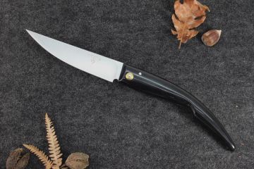 Couteau capucin élégant, un style, l'interprétation personnelle du couteau traditionnel capucin des Pyrénées Ariégeoises. A table, il sera votre fierté. Manche en pointe de corne noire, très dure, matière noble, sobre et élégante. Lame en acier inoxydable 12c27 sans entretien particulier.