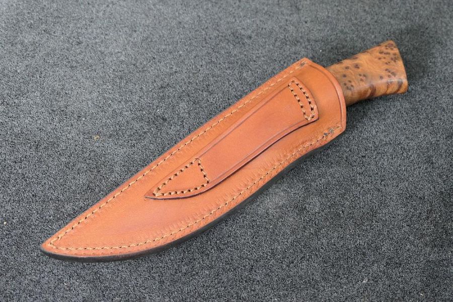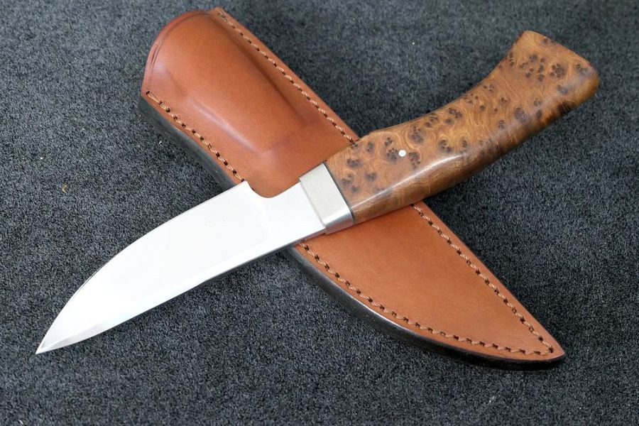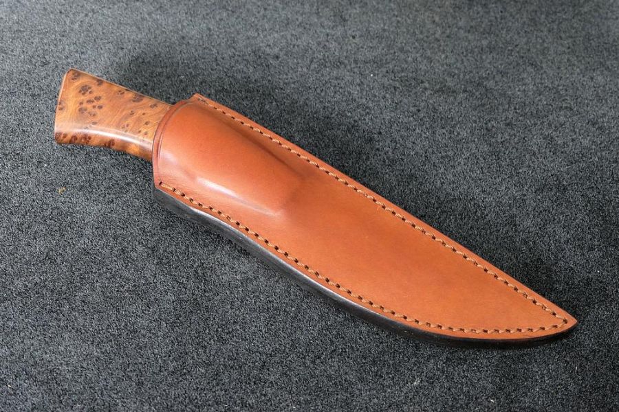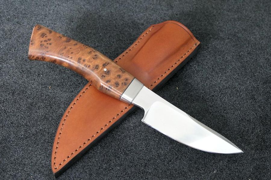 - Le manche en loupe de thuya, bois exotique au très beau veinage. Afin de préserver la souplesse du bois, huiler le manche de temps en temps avec de l'huile de lin diluée avec de l'essence de térébenthine pour le nourrir, puis frotter avec un chif