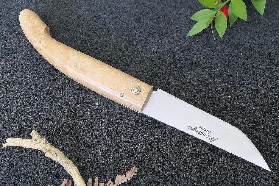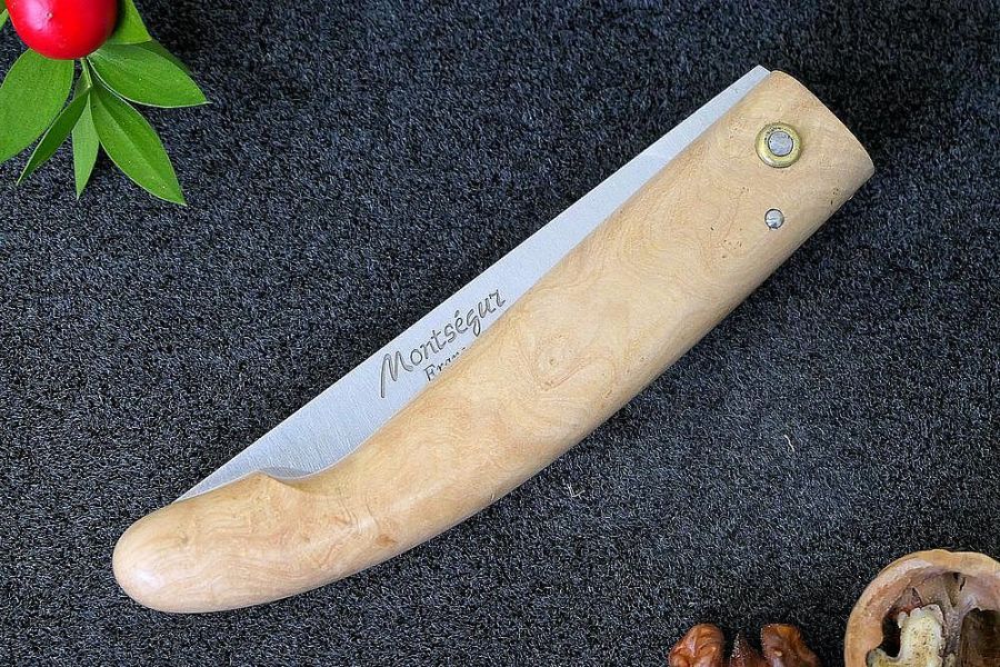 - Le manche monobloc en ronce de frêne est un matériau naturel et vivant, afin de préserver la souplesse du bois, huiler le manche de temps en temps pour le nourrir. Il peut arriver qu'avec le temps, en séchant, un ré-ajustage du sertissage du rivet soit nécessaire.