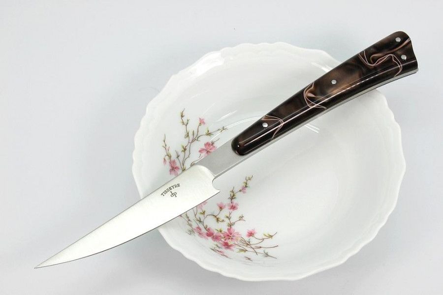 Le couteau de table artisanal l'As de table, lame acier Alenox 18cr, manche en acrylique marron filets blancs est une création originale, un design moderne, il est fabriquée en série par la coutellerie Couteaux Tisseyre.