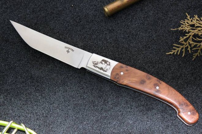 Le Couteau pliant Baroudeur gravure sanglier lame acier RWL34 manche en ronce de thuya est le meilleur couteau pliant artisanal de série réalisé par la coutellerie Couteaux Tisseyre.