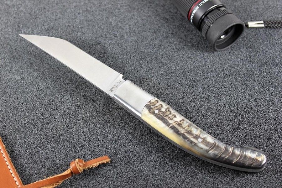 - Le manche est réalisé en croûte de corne de bélier foncée, chaque couteau sera différent et unique, si la corne perd son aspect brillant, huiler le manche pour le nourrir.