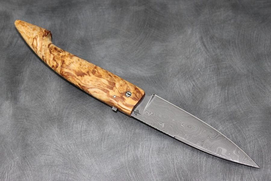 Sa lame damas explosion en feuille de sauge traditionnelle, son manche en superbe ronce de hêtre stabilisée originale et unique.