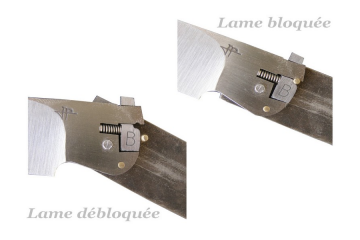 - Le mécanisme à cran d'arrêt breveté est une innovation sur les couteaux capucins traditionnels, seul mécanisme totalement intégré dans le talon de la lame. A l'ouverture, le blocage en position ouvert est automatique. Pour la fermeture, une pression vers l’avant sur la bascule libère l’axe d’arrêt, déverrouillant ainsi la lame, la fermeture est alors autorisée.