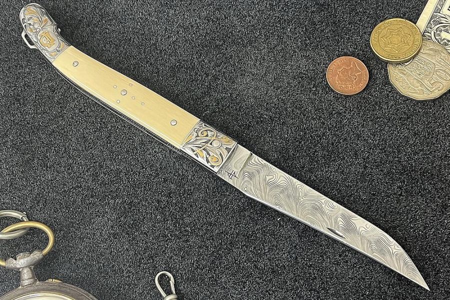 Le couteau design Laguiole lame damas inox gravure et incrustations en or est un couteau pliant artisanal de luxe. Une pièce unique fabriquée de toutes pièces par Jean-Paul TISSEYRE artisan coutelier Meilleur Ouvrier de France en Occitanie