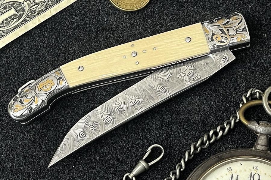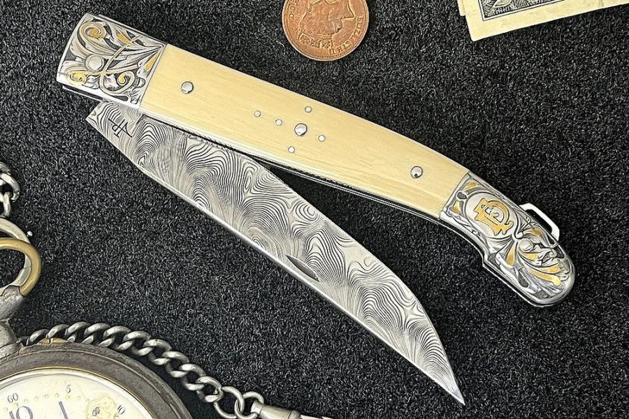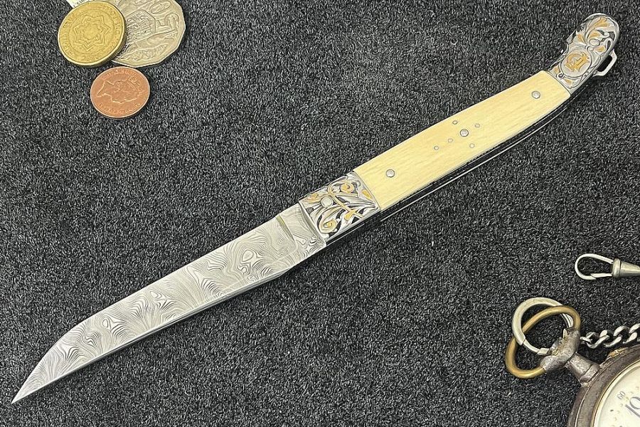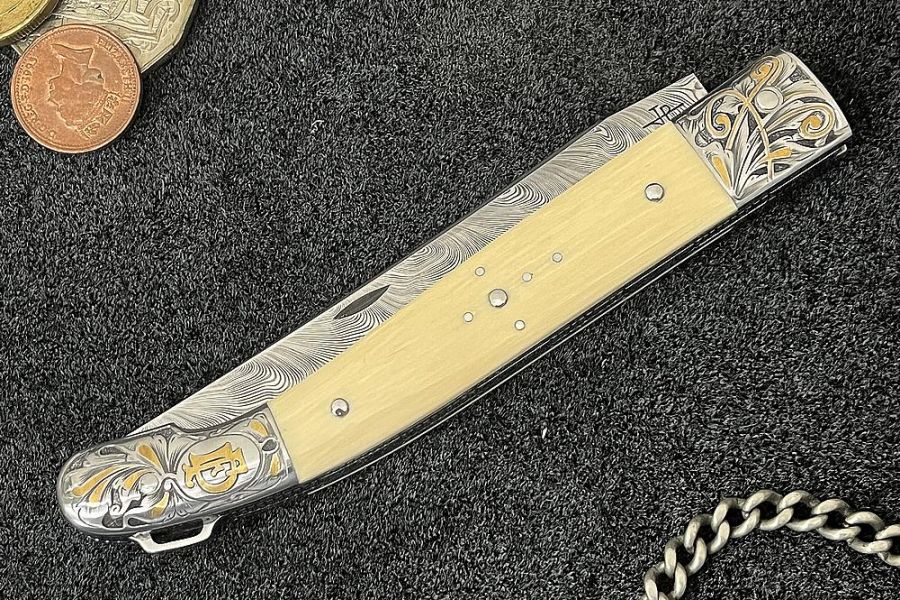 Gravure et incrustations en or réalisé par Mme Da Justa. Lame en acier damas inox, manche en ivoire de mammouth blanc.