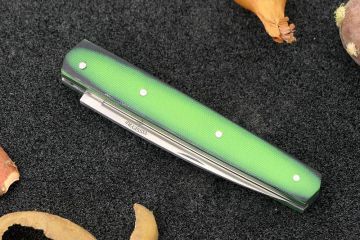 - Manche : plaquettes en G10 texturé vert montées rivetées sur platines en inox Z20 d'épaisseur 1,2mm.