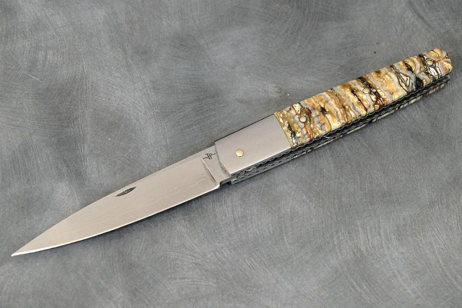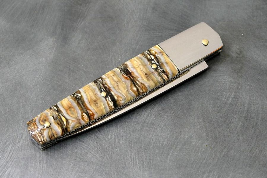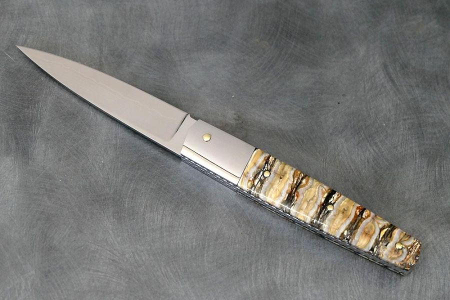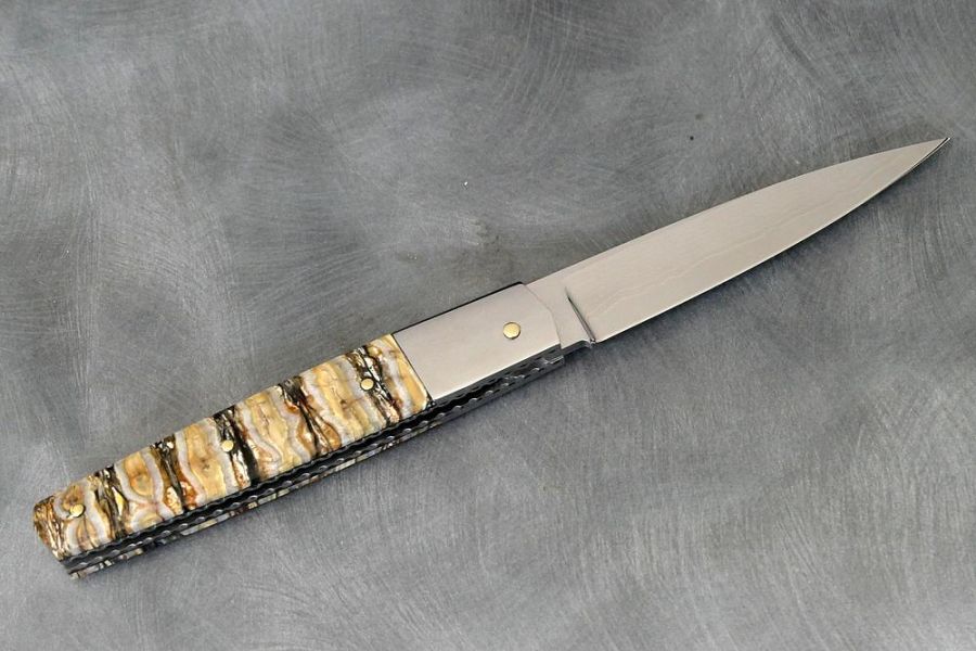 Manche original en molaire de mammouth stabilisée, lame damas inox SGPS. Guillochage original sur dos de lame et ressort