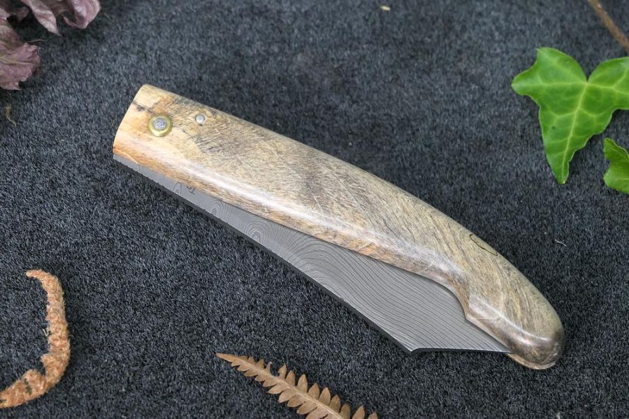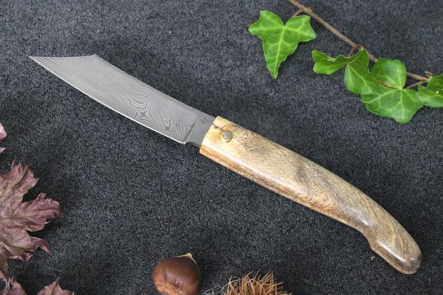 Couteau pliant Patriarche lame damas carbone manche marronnier stabilisé