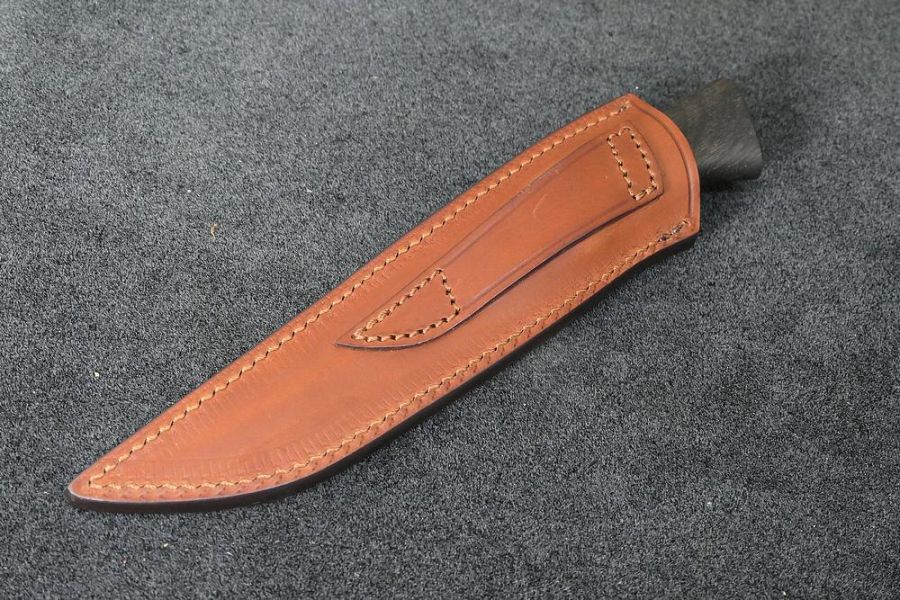 Manche original en morta, chêne des marrais en cours de fossilisation, lame acier RWL34. Housse cuir, réalisée par Pony